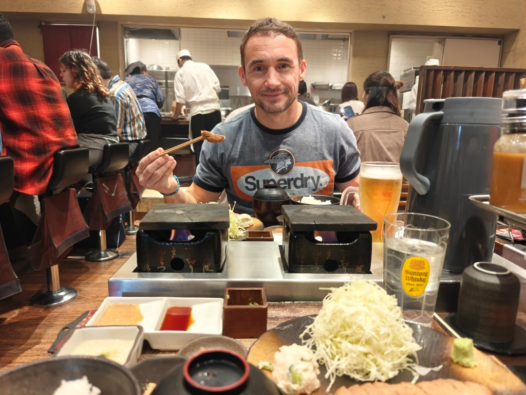 Como no nos podían dar la habitación hasta las 14:00, dejamos la maleta y nos fuimos a comer a un sitio que ya teníamos acechado, el Gyukatsu Motomura, dónde comimos muy bien su especialidad, el Gyukatsu, una carne de wagyu muy muy rica … Y todo a un precio inimaginable, 5000 yenes los dos (Unos 25 euros al cambio).