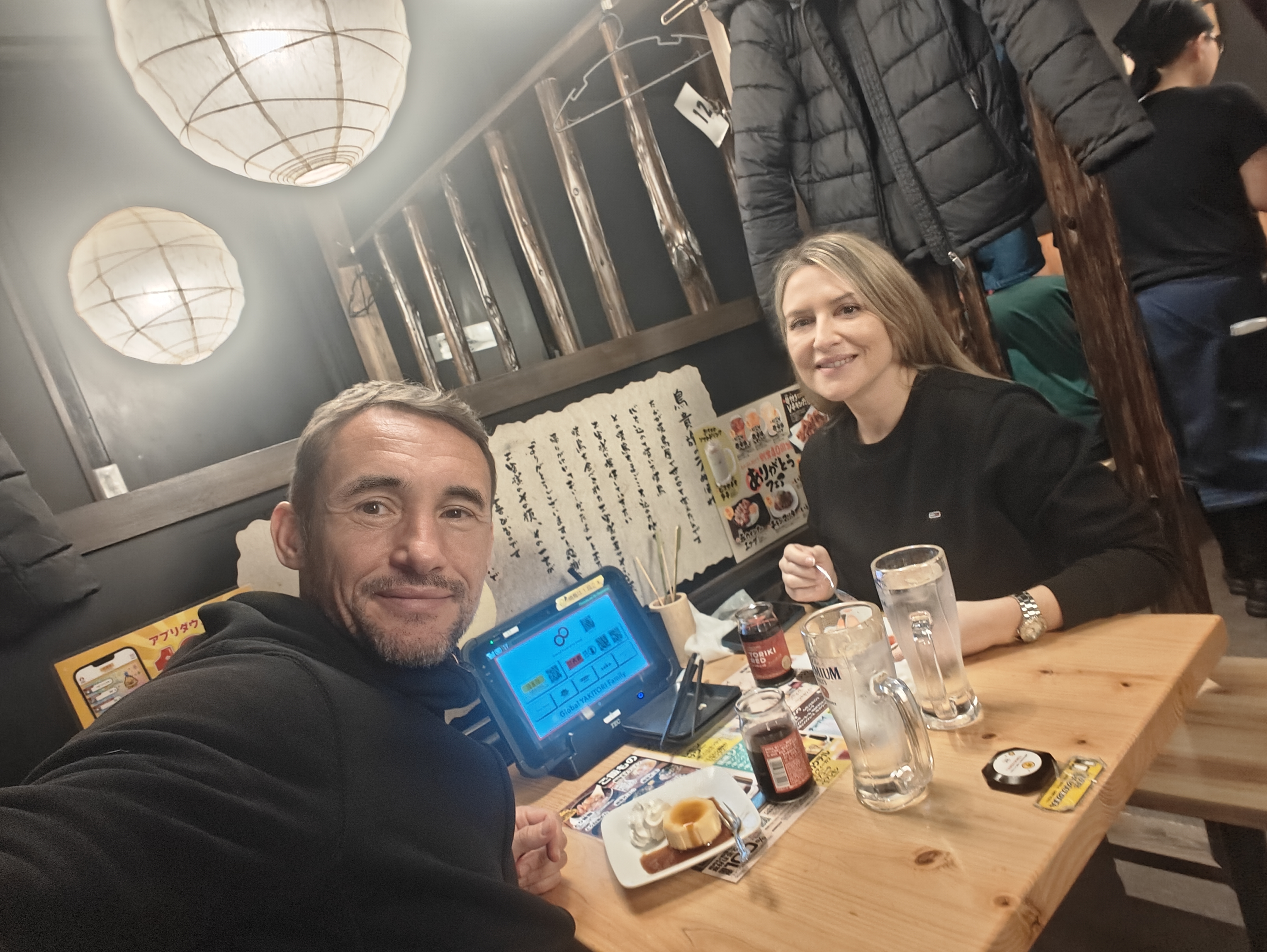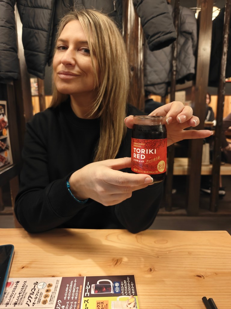 Tras una siesta de cinco horas para recuperar el sueño perdido, salimos a cenar a otro acierto de sitio, el Yakitori Torikizoku, dónde degustamos los yakitoris, que son unas brochetas de pollo muy ricas acompañadas de un vino afrutado, el Toriki, que regó la velada con su sabroso aroma. El sitio en sí nos hizo sumergirnos en la cultura japonesa con sus costumbres y decoración, lo cuál nos encantó a los dos. De camino al hotel hicimos una visita al 7 Eleven y nos vinimos a la habitación .. ¿Pasará algo antes de dormir?….